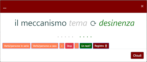 Per imparare le cose bisogna fare esercizio: non è un dramma, e lo sarà anche meno se, invece di cimentarci con compiti prefabbricati e assegnati da altri, creeremo i nostri esercizi da noi. Qui, come in un self-service, potete selezionare tutti i tempi e i modi su cui volete testare le vostre conoscenze. Una volta operata questa selezione, passerete alla sezione in cui scegliere, punteggi, tempi e modi dell'esecuzione degli esercizi (le opzioni sono molte e -si spera- utili a vincere la monotonia). Naturalmente sulla base delle vostre scelte il programma assegnerà al vostro esercizio una valutazione di ranking che concorrerà al punteggio finale del corso. Alla fine di ogni esercizio potrete, se volete, affrontare un breve corso di recupero centrato sui vostri errori e, soprattutto, salvare i risultati nel cloud. Questo vi consentirà di controllare i vostri progressi e di farli controllare a chi vi insegna. Buone scelte.